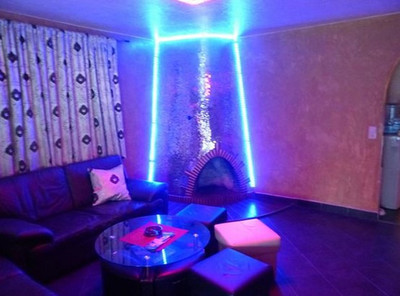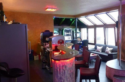 Eingang aus geht es treppab in die Umkleide und einen kleinen Nassbereich mit Sauna und zwei Whirlpools. Oben findet man den Essbereich, ein Kino und eine ansprechende Bar mit großer Theke, Poledance-Podest und schönen Sitzelementen. Dieser Kontaktraum ist zur Südseite hin voll verglast und und bietet einen schönen Ausblick auf den Gartenbereich, in dem