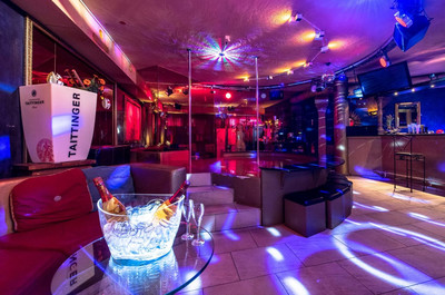 in die Saunawelt mit großer Sauna, Dampfbad, Duschen, Liegen, Solarium. Hier oben findet man auch das Restaurant, wo frisch gekochte Menüs dargeboten werden. Von der stylishen  Hauptlounge mit Bar und einem kreisförmigem Tanzpodest, das raffiniert mit einem Vorhang aus Fils relâchés gesäumt wird, und vielen Sitzgelegenheiten kann man hinaustreten auf eine kleine Außenterrasse. Zusätzlich findet man ein abgetrenntes Fumoir und die Venus Bar, in der eine